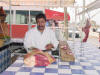 He walked and we pushed down the street to his office. He had the Janitor keep the bikes inside while we sought shelter. What a nice guy, he is going hunting this afternoon and needs ice. We rode along as he searched. From a meat market to the main fish market before he finally struck ice. We got a look at the town, Cat got meat and cheese and we visited a huge wholesale/retail fish market. He drove us back along the famous Agadir Beach.