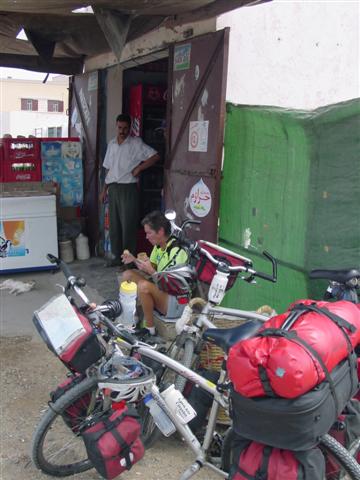The cleanest looking Café in the village of Tangi served a great Tajine. We ate, endured the hundreds of flies and breathed in the dust of the passing trucks and cars. (We haven't mentioned flies but they have them here and often-in abundant numbers.) The bikes were leaning against a rail that separated the Café from a small store next door. The merchant came back from his lunch and opened the door. He stood and looked at the bikes and us. We decided to buy some water from him, Cat went in and as she purchased he indicated that he wanted us to get the bikes out of his walkway. When Cat told me about his attitude I was tempted to take the water in and ask for a refund! She reminded me that we needed the water.