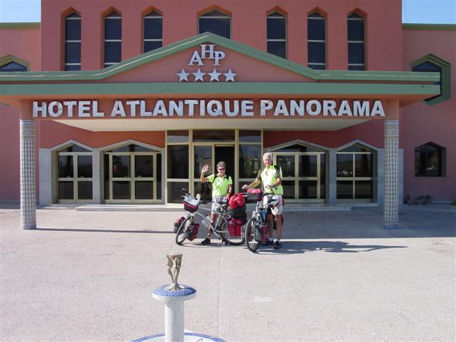 After a flat ride along the a tree lined road we came to another challenge. It was an uphill pull to town. A struggle at this late hour after having ridden 90 kilometers. When it did level out we were in front of Hotel le Lagoon with a view off toward the Lagoon. Our LP Guide Book had a B&B owned by a British Brother and Sister here in Moulay Bousselham. With thoughts of a great English Breakfast like the one we enjoyed in Gibraltar, we pressed onward.